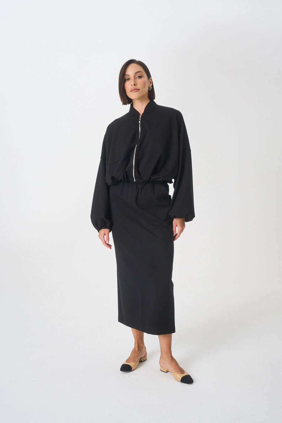 Górą wykończona stójką. Zapięcie na suwak.