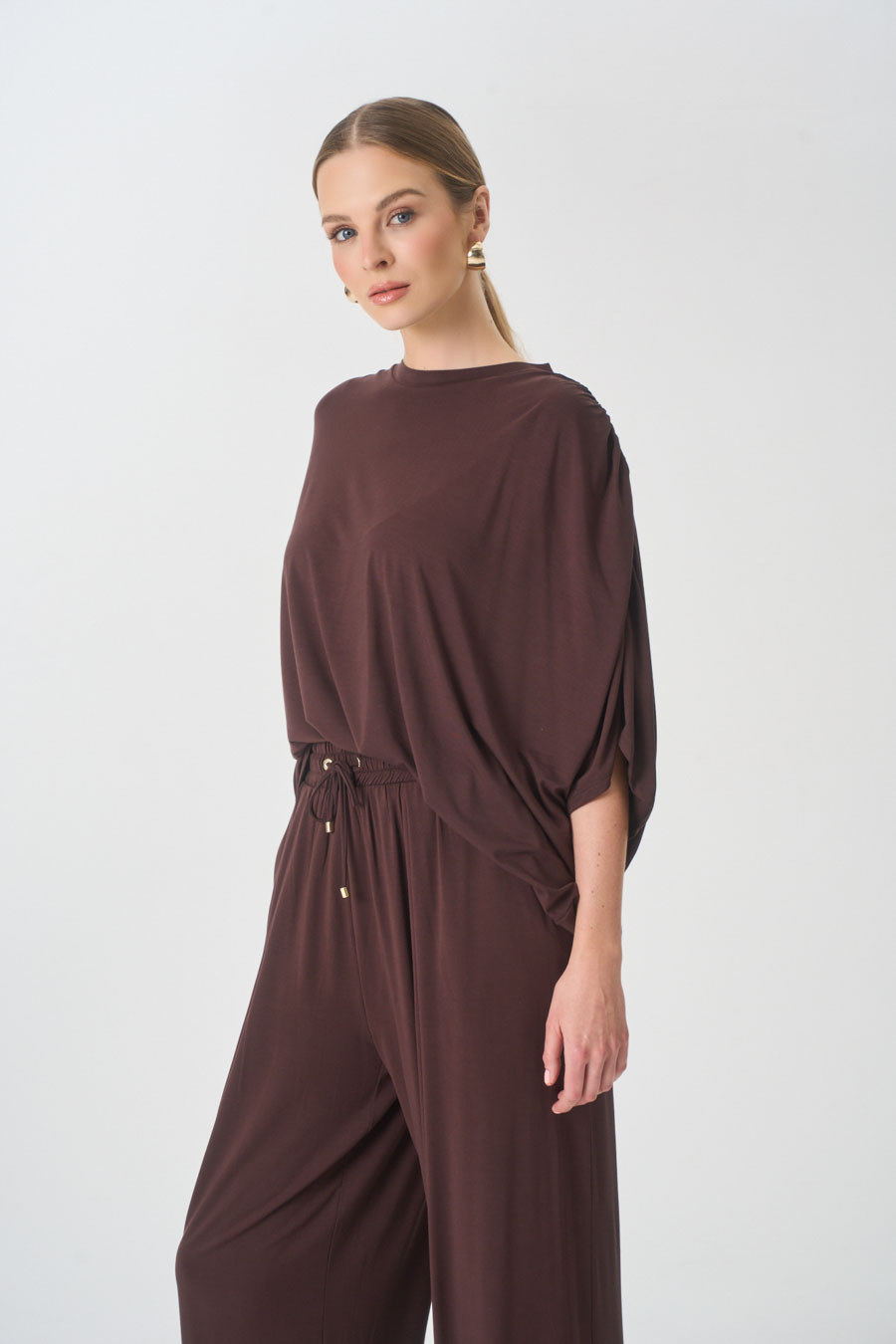 Dekolt w łódkę, linia ramion z marszczeniem.