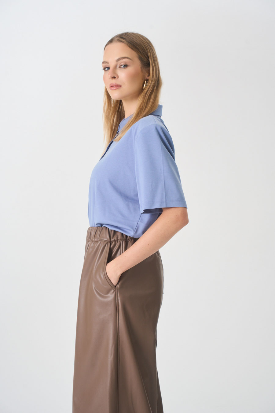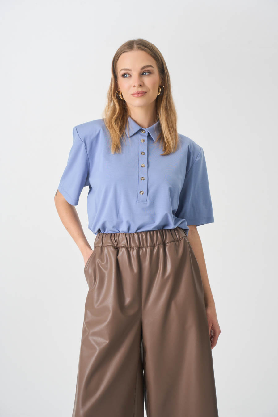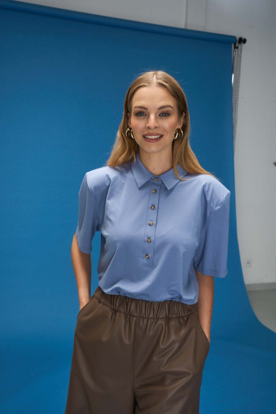 Dekolt polo z kołnierzykiem, logowane guziki.