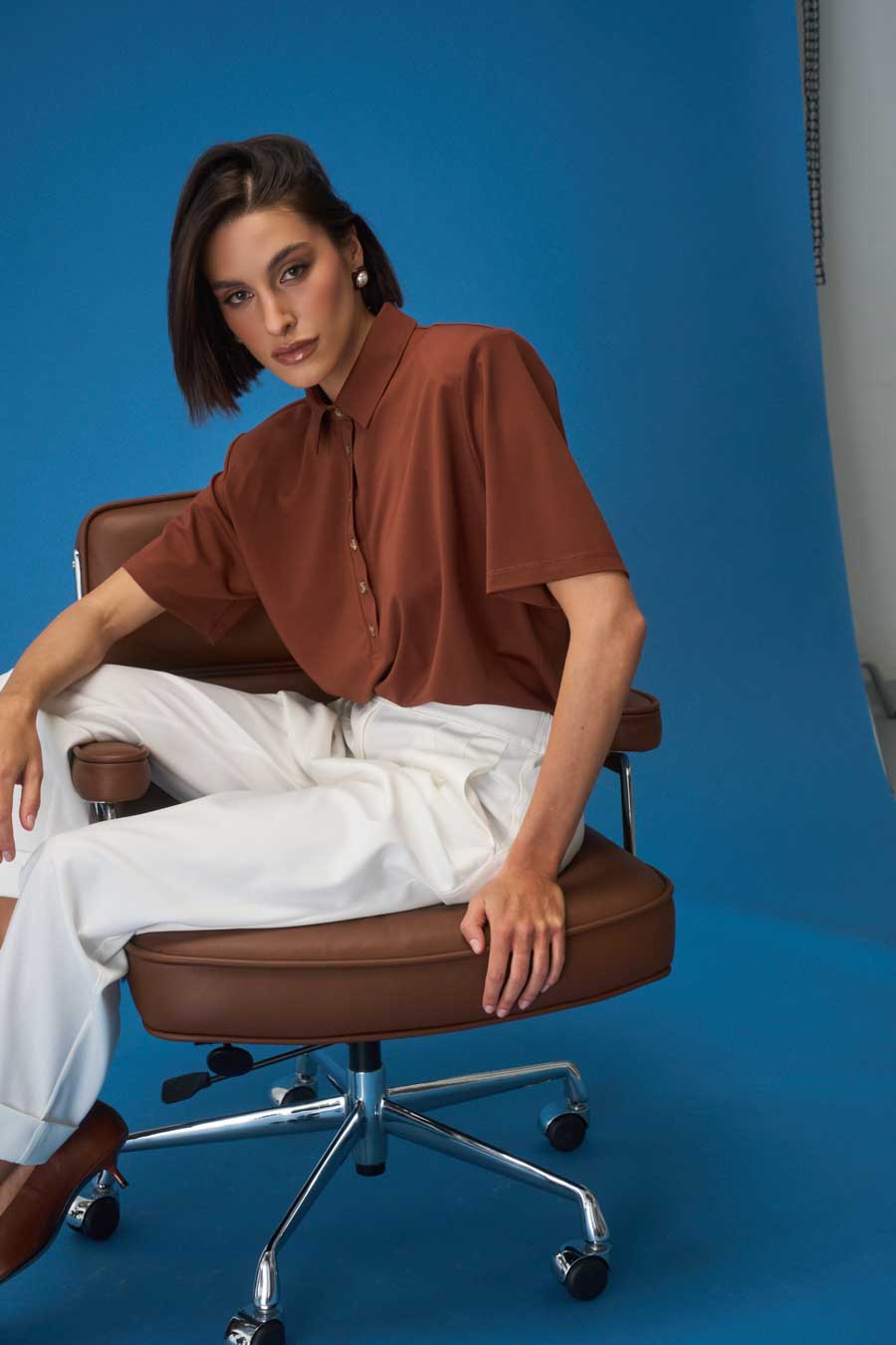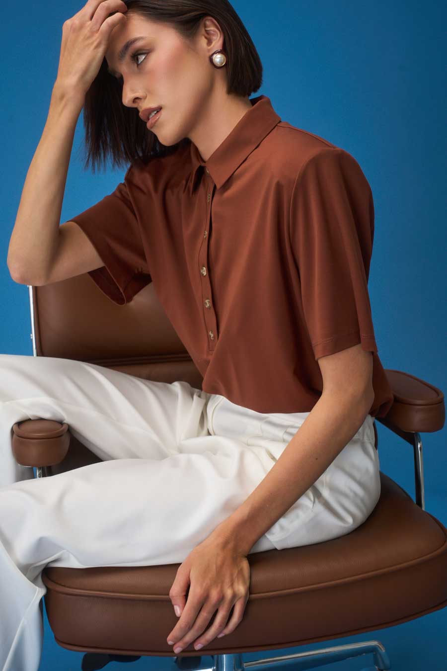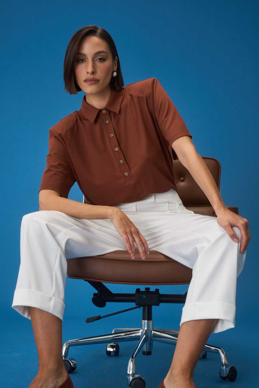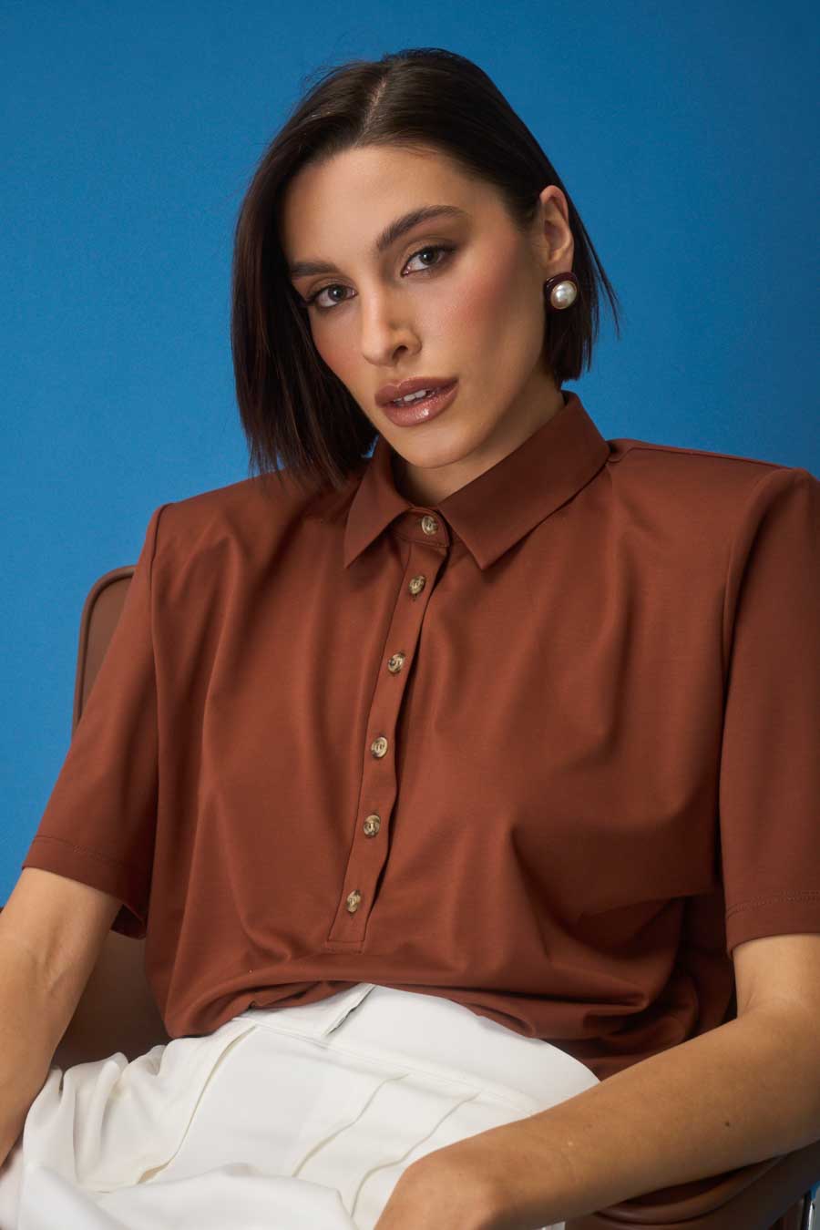 Dekolt polo z kołnierzykiem, logowane guziki.