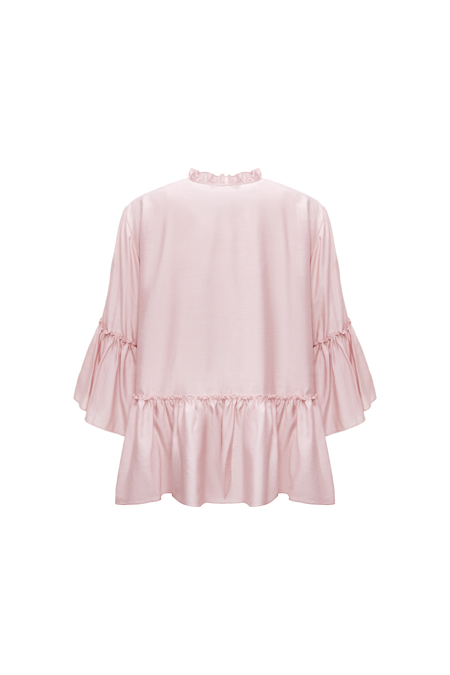Obszerny rękaw 7/8 i dół bluzki ozdobną falbaną.