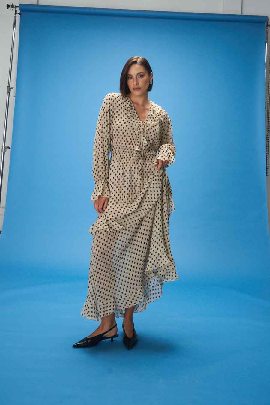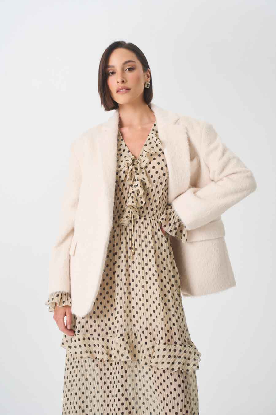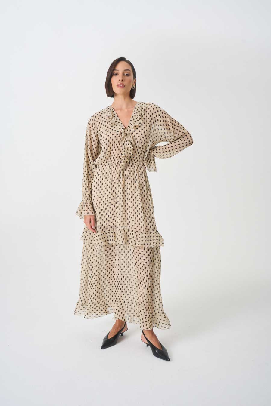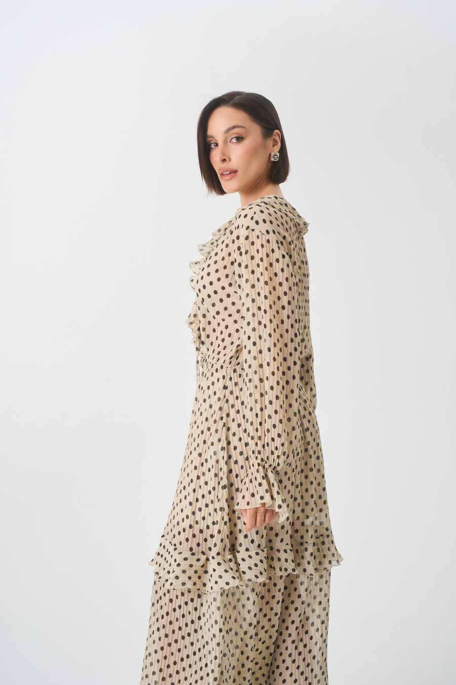 Dekolt z falbanki i trokami z ozdobnymi końcówkami.