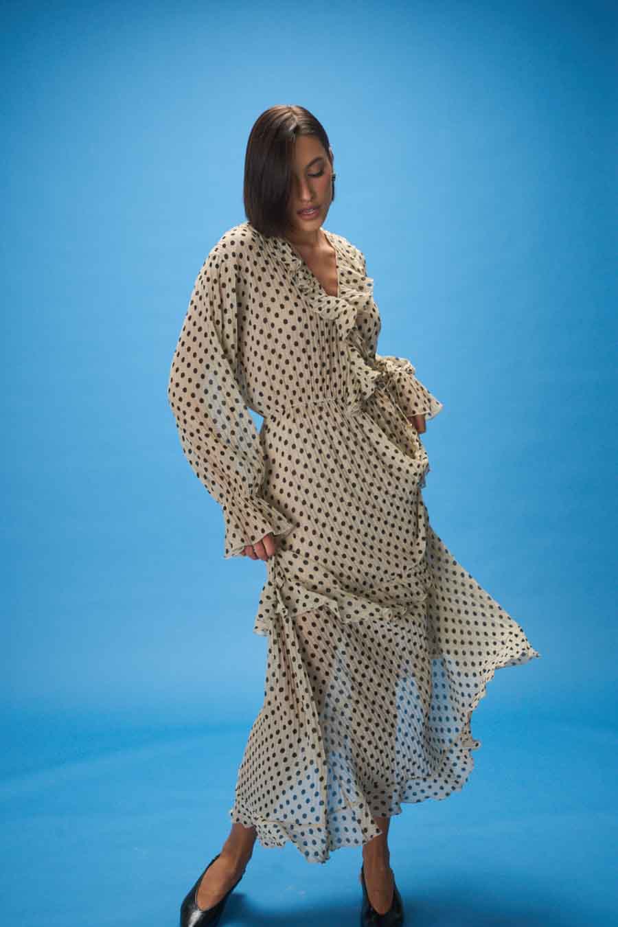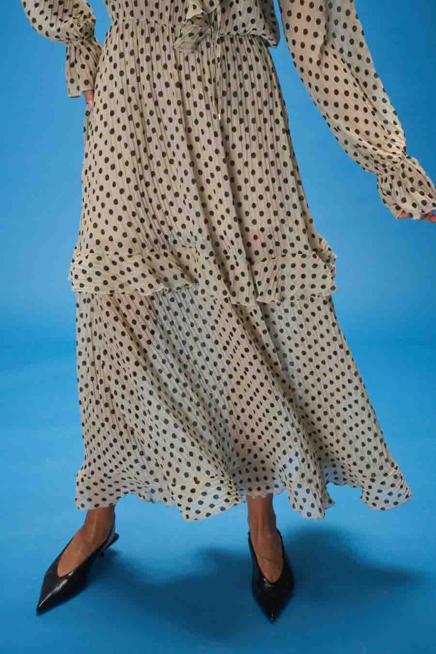 W pasie guma, rozkloszowany z ozdobnymi falbanami.