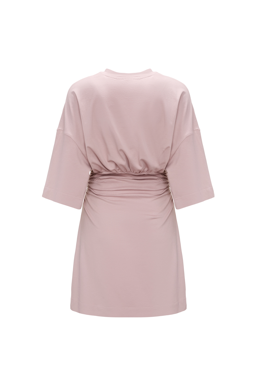 Szerokie, krótkie rękawy. Po bokach sukienki marszczenie.