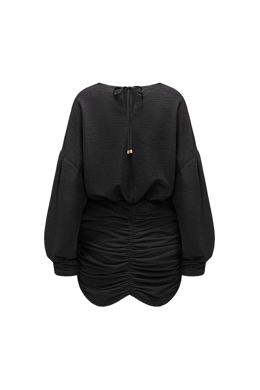 Dół sukienki wątki z drapowaniami podkreślającymi figurę.