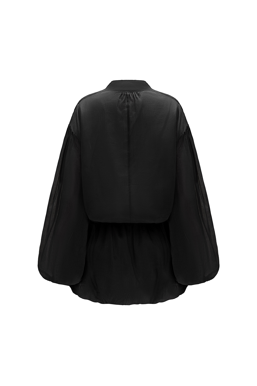 Lekko oversizowa, koszulowa góra, dekolt wykończony stojką.